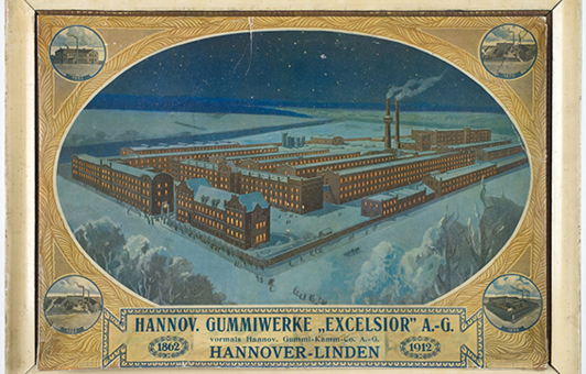 Dargestellt ist das Firmengelände der 1862 als „Hannoversche Gummikammfabrik“ gegründeten und 1912 in „Excelsior“ umbenannten Fabrik in Limmer.