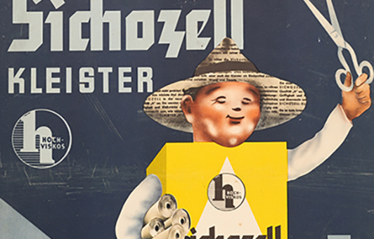 Geworben wird für den „hochviskosen“ Tapetenkleister Sichozell, der sich „sofort in kaltem Wasser“ löst. Besonders schön ist, dass ein Exemplar der auf dem Plakat abgebildeten Kleister-Schachtel, die den Körper der Werbefigur bildet, ebenfalls in den Beständen des HMH vorhanden ist.