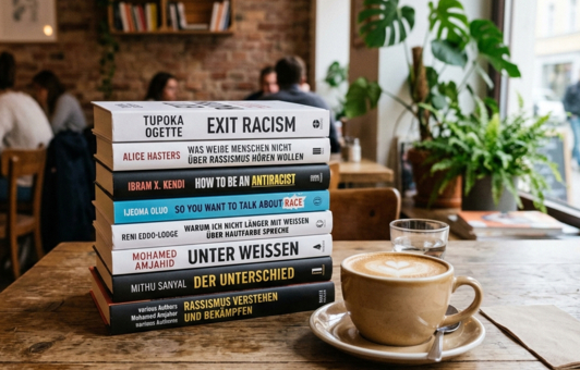 Offenes Buchcafé für alle Interessierten: Eine Auswahl an Literatur zur Rassismuskritik, Empowerment und gesellschaftlicher Verantwortung, die zum Lesen, Stöbern und Gesprächen einlädt.